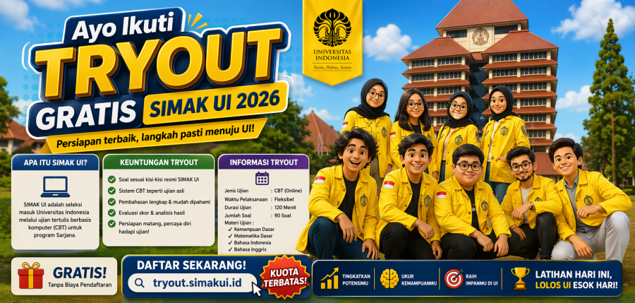 Banyak peserta SIMAK UI gagal bukan karena tidak pintar, tetapi karena tidak terbiasa dengan sistem ujian dan tekanan waktu. Saat ujian berlangsung, mereka panik, salah strategi, dan tidak maksimal dalam mengerjakan soal. Padahal, SIMAK UI dikenal sebagai salah satu seleksi mandiri paling kompetitif. Tanpa latihan yang tepat, peluang lolos akan semakin kecil. Karena itu, tryout gratis ini bisa menjadi langkah awal untuk mempersiapkan diri secara serius.