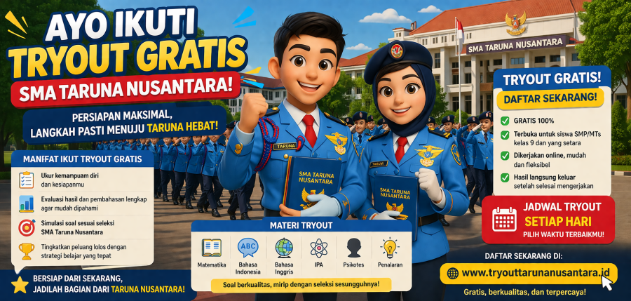 Semakin sering latihan, semakin besar peluang untuk lolos. Mulai sekarang, ayo ikuti Tryout Gratis SMA Taruna Nusantara di PLC Pekanbaru dan tingkatkan persiapanmu.
